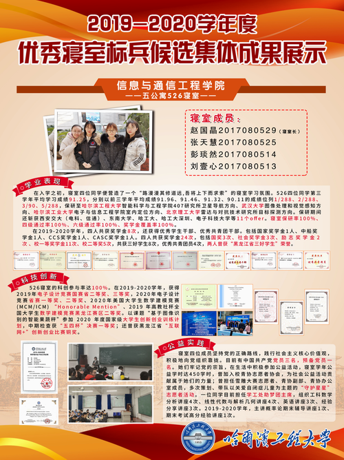 526四位同学第三学年平均学习成绩91.25,分别以前三学年平均成绩91.96、91.46、91.32、90.11的成绩位列1/288、2/288、3/90、5/288,保研至beat365正版唯一官网必一智能科学与工程学院407研究所卫星导航方向、武汉大学图像处理和视觉感知方向、哈尔滨工业大学电子与信息工程学院室内定位方向、北京理工大学雷达与对抗技术研究所目标探测方向。寝室保研率100%、四级通过率100%、六级通过率100%、奖学金覆盖率100%。在2019-2020学年,四人共获奖学金8次,还获得优秀学生干部、优秀共青团干部。包括国家奖学金1人、中船奖学金1人、CCS奖学金1人、CASC奖学金1人。四人共获奖学金24次, 包括国奖3次、社会奖学金3次、励志奖学金2次、校一等奖学金11次、校二等奖5次,共获三好学生8次,优秀共青团员4次,两人曾获“黑龙江省三好学生”荣誉。
