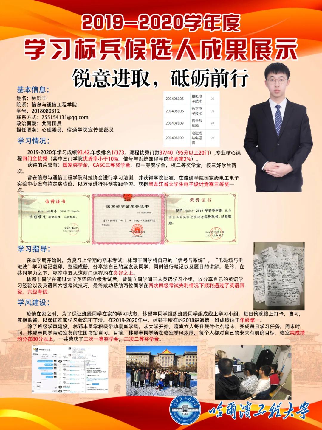 林郅丰,2018级电子信息工程专业,2019-2020年学习成绩93.42,年级排名1/373,课程优秀门数37/40 (95分以上20门) ,专业核心课程四门全优秀(其中三门学院优秀率小于10%,信号与系统课程学院优秀率2%)。获得的荣誉有:国家奖学金,CASC三等奖学金, 校一等奖学金,校二等奖学金,校三好学生两次。获得黑龙江省大学生电子设计竞赛三等奖一次。