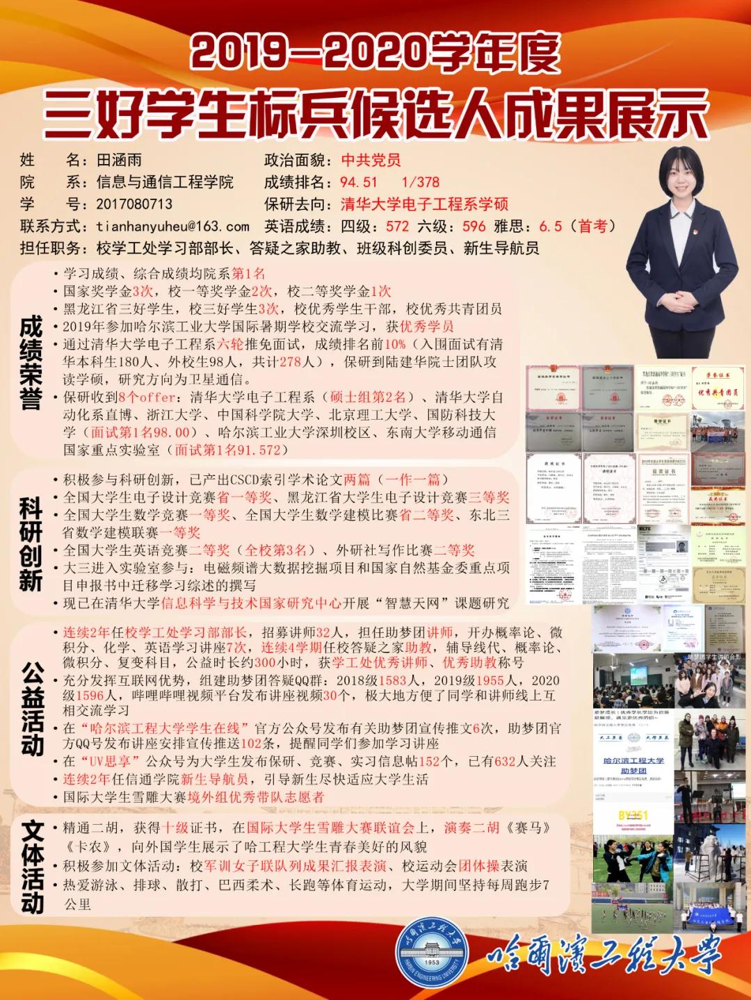 田涵雨,2017级电子信息工程专业,中共党员,成绩:94.51,年级排名:1/378,保研至清华大学电子工程系学硕,英语成绩:四级572六级596雅思6.5(首考),获得过国家奖学金3次,校-等奖学金2次,校二等奖学金1次。黑龙江省三好学生,校三好学生3次,校优秀学生干部,校优秀共青团员。