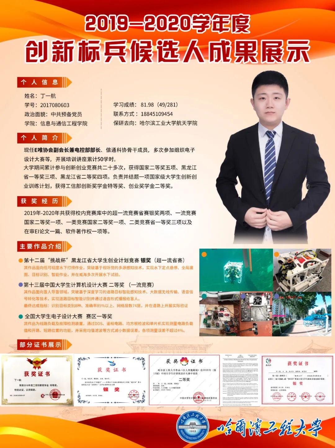 丁一航,中共预备党员,成绩:81.98,保研至哈尔滨工业大学航天学院,现任E唯协会副会长兼电控部部长、信通科协骨干成员,多次参加组织电子设计大赛等,开展培训讲座累计50学时。获得国家二等奖五项、黑龙江省一等奖三项、黑龙江省二等奖四项。负责并结题一项国家级大学生创新创业训练计划,获得工信部创新奖学金特等奖、创业奖学金二等奖。2019年-2020年共获得校内竞赛库中的超一流竞赛省赛银奖两项、一流竞赛国家二等奖一项、一类竞赛国家二等奖一项、二类竞赛省一等奖三项以及在审EI论文一篇、软件著作权一项等。第十二届“挑战杯”黑龙江省大学生创业计划竞赛银奖(超一流省赛),第十三届中国大学生计算机设计大赛二等奖(一流竞赛),全国大学生电子设计大赛赛区一等奖。