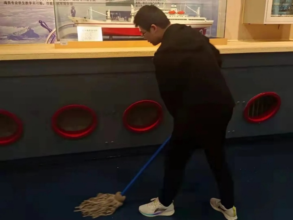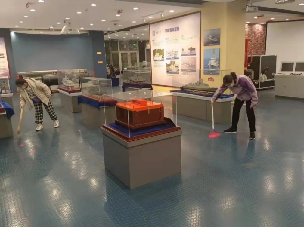下午五时二十五分,志愿队成员们在船舶馆门口集合,有序进入船舶馆。在船舶馆中,志愿队成员们分工明确,扫地,拖地,擦玻璃展柜,帮助整理相关模型以及装饰,大家积极参与,打扫好馆内的每一角落。
