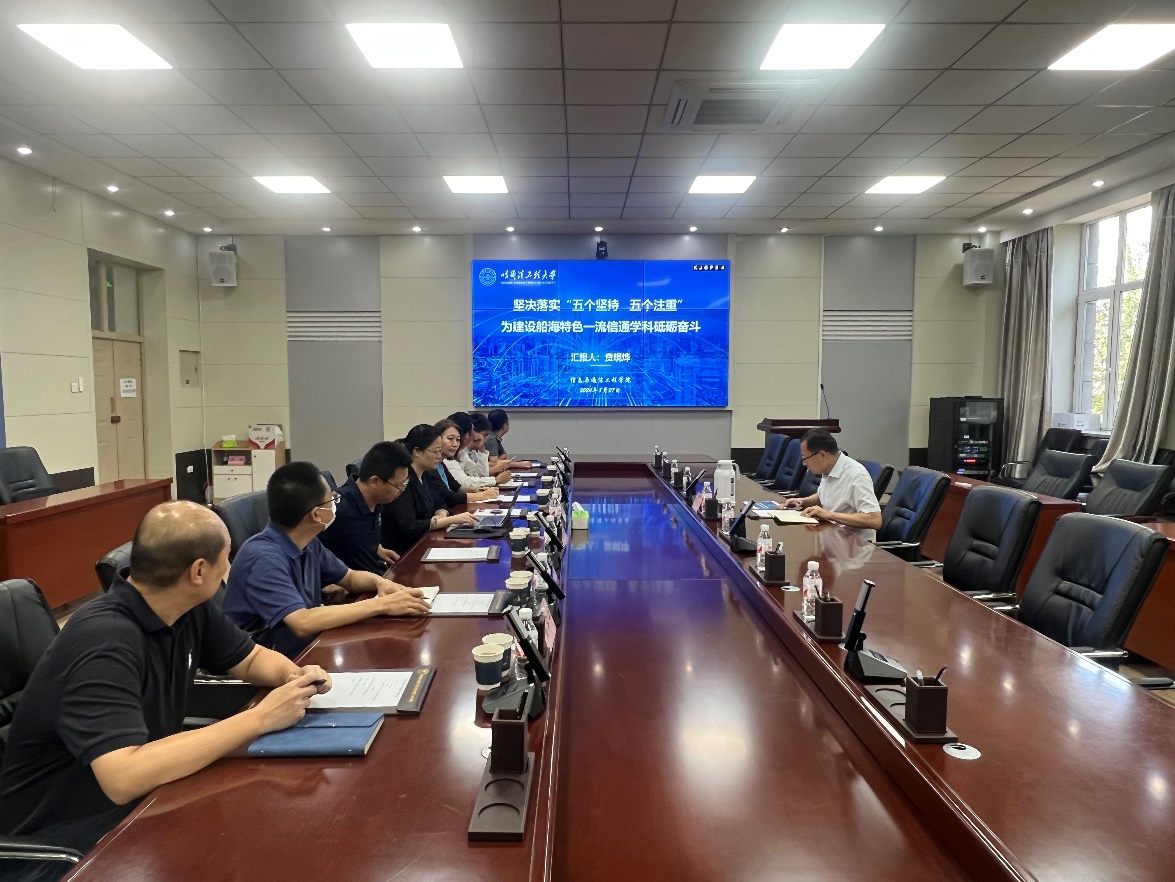 学院领导班子以《坚决落实“五个坚持 五个注重” 为建设船海特色一流信通学科砥砺奋斗》为题,围绕贯彻落实校暑期务虚会议精神、关键业绩指标完成情况、下一步主要工作等,就学科方向、本科生人才培养、研究生人才培养、国际合作、科学研究、师资队伍建设等方面工作进行汇报。