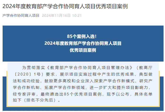 近日,教育部公布了 2024年度产学合作协同育人项目优秀案例评选结果,beat365正版唯一官网必一光电所单明广教授负责的《基于飞腾嵌入式系统的创新创业教育改革实践》项目(合作企业:飞腾信息技术有限公司)脱颖而出,成功入选 “创新创业教育改革” 4个范例之一。该项目紧密结合新工科人才培养需求,深度融合校企资源,创新育人模式,在多方面取得了显著成效。