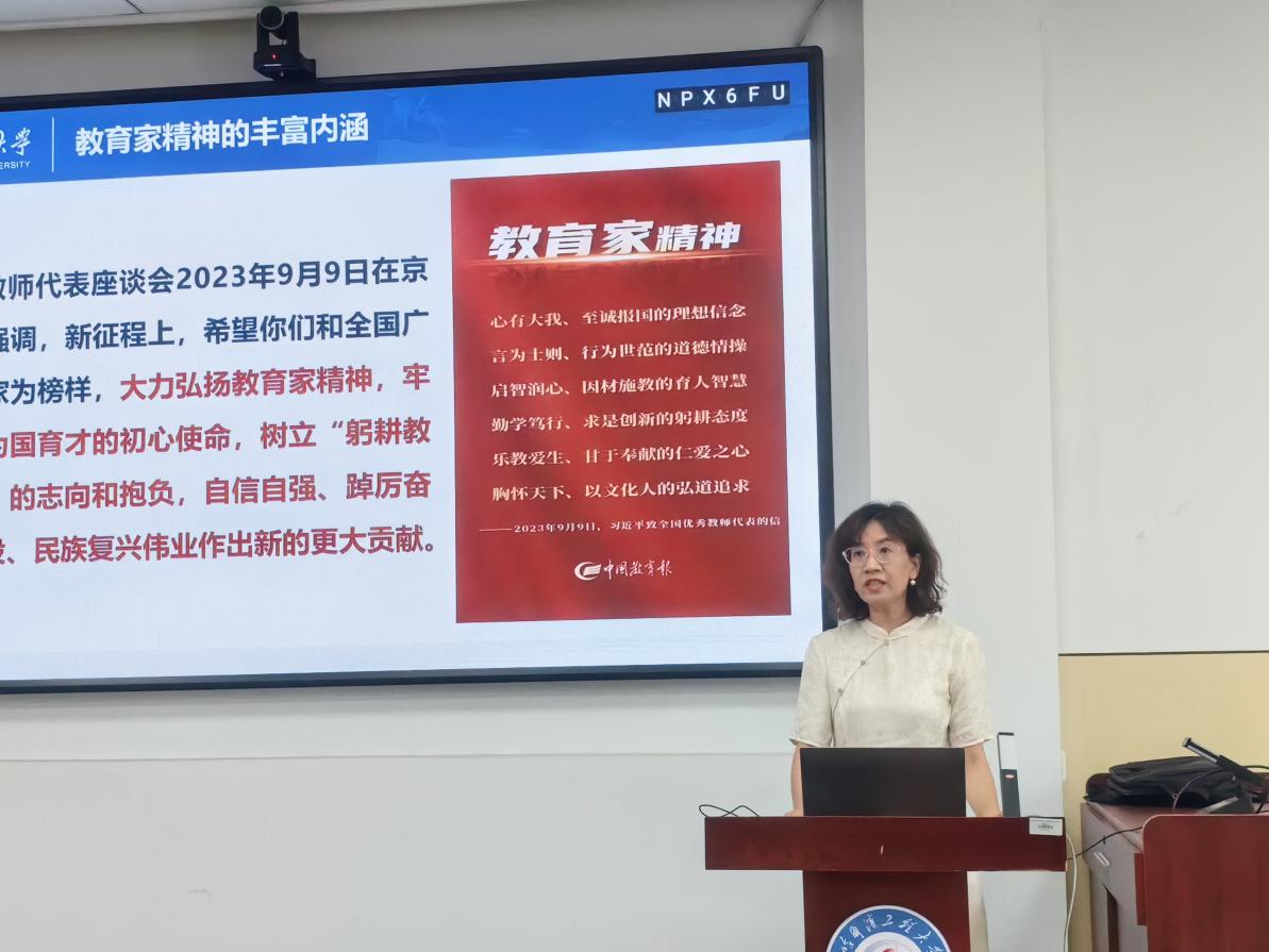 王晓迪以“大力弘扬教育家精神,严守师德底线,努力做新时代‘大先生’”为主题,从教育家精神的内涵出发,通过案例分析、政策解读等方式,引导教师们深刻认识到师德师风建设的重要性。她鼓励教师们要坚守教育初心,牢记育人使命,努力成为学生成长道路上的引路人。